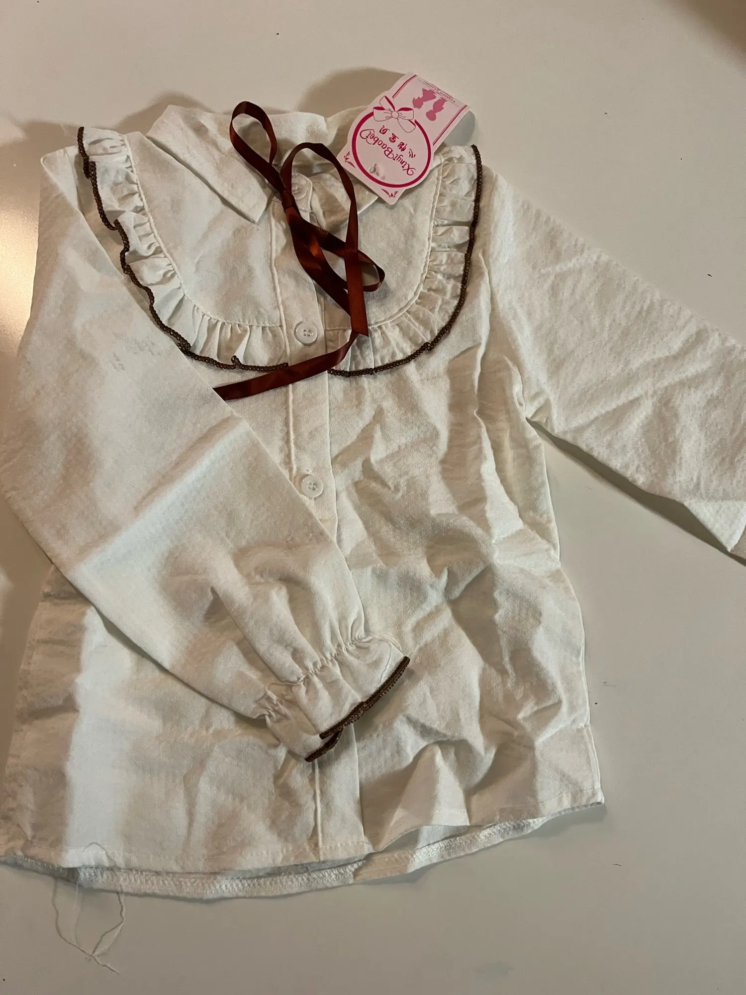 This sophisticated long-sleeve blouse features whimsical frilled ribbon bows to add a touch of flair. Crafted from a lightweight fabric, it's perfect for a variety of formal and semi-formal occasions. Its unique style and premium fabric make it a must-have for any fashionable wardrobe.