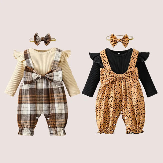 Baby Girls Plaid or Dotted Long-sleeved Jumpsuit w/Headband